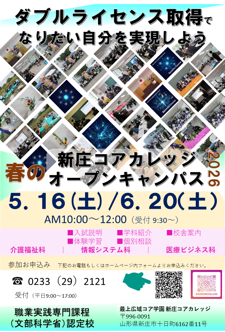 学校からのお知らせ 春のオープンキャンパス(第1回、第2回) 申し込み受付中 お知らせ 春のオープンキャンパス(第1回、第2回) 申し込み受付中 2026年4月10日 学校からのお知らせ 春のオープンキャンパスを5月16日(土)/6月20日(土)に開催します。お申し込みはこちらから! < 戻る 一覧 CATEGORY 学校からのお知らせ 大切なお知らせ コアだより ARCHIVE 2026年 2025年 2024年 2023年 2022年 2019年 2018年 2017年 NEW ARTICLES 春のオープンキャンパス(第1回、第2回) 申し込み受付中 コアだより 令和8年度 祝入学 コアだより 令和7年度 祝卒業