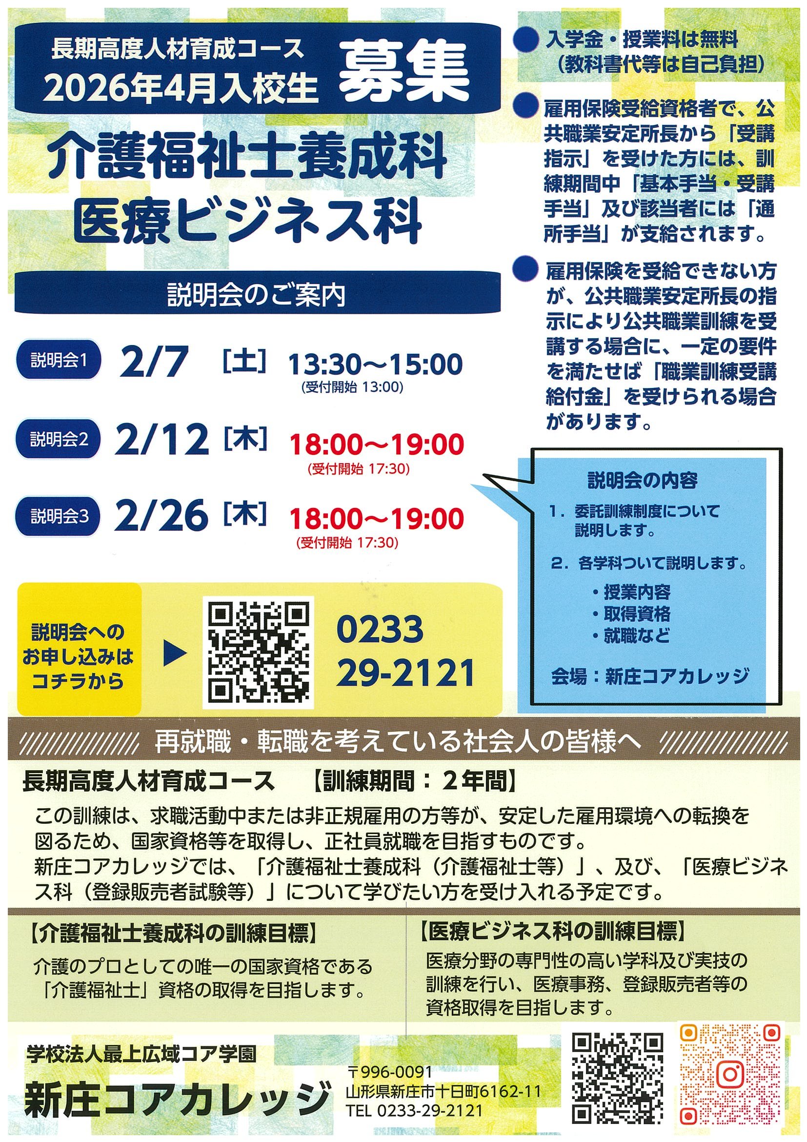 2026年4月に開講する介護福祉士養成科と医療ビジネス科の受講生を募集します。入学金・受講料は2年間無料です。